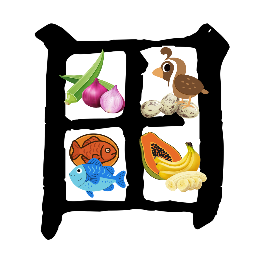 The integrated farming system is designed to supply food for one 3-5 member family. We divide a 14m x 14m land into Four Squares (hence the name). Each 7m x 7m square produces fruits, vegetables, fish, and quail.